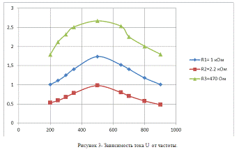 на колебательном контуре. На частоте 500 Гц наблюдается резонанс, при котором