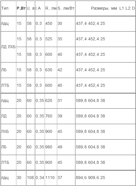 табл. наведені характеристики найбільш поширених ЛЛ денного світла. Позначення:
