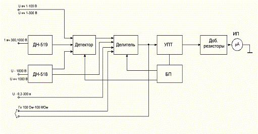 магнитоэлектрического микроамперметра. Диапазон измерения 100 мВ … 1000 В.