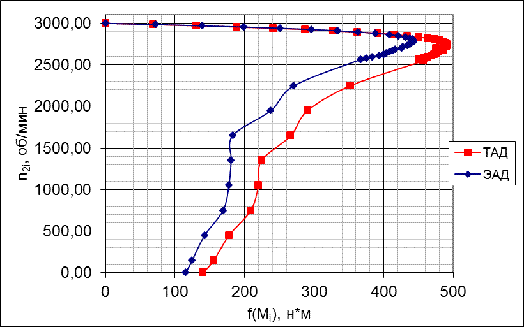 возрастает, а затем медленно уменьшается; зависимость момента двигателя от