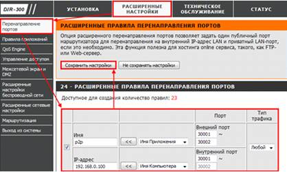 выбрать пункт «Перенаправление портов», прописать TCP и UDP-порты, указанные в