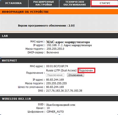 Раздел Internet. Отображаются данные и статус подключения к сети Internet. Все данные появляются