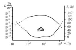 эта область заштрихована). Из диаграммы видно, что интенсивности звуков