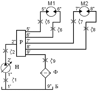 устройства: гидроцилиндр и два гидромотора. В задании указаны условия