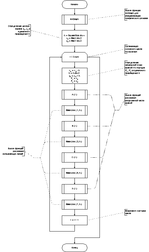 Ее задача - установить начальную точку кривой, т.е. исходные координаты пера (Px и Py) и единичную длину приращения h. Квадрат, где рисуется кривая, помещается в