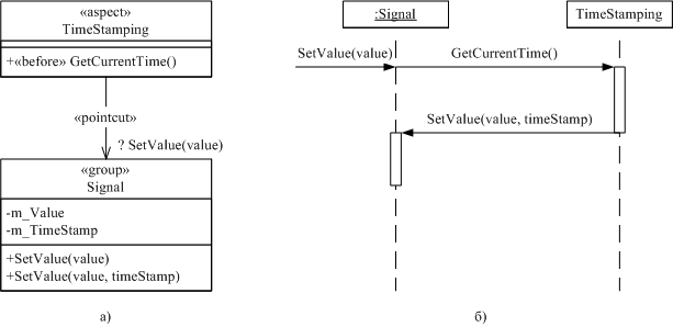 “aspect”. Для методов аспектного класса вводятся стереотипы “before”, “after”,