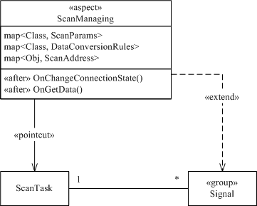 диаграмме классов достаточно показать связь аспекта и одной группы (см. рис.