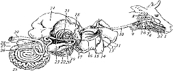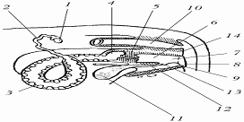 околоушная слюнная железа; 9 - трахея; 10 - пищевод; 11 - печеночный желчный