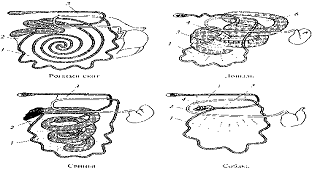 ободочная кишка; 27 - подвздошная кишка; 28 - слепая кишка; 29 - прямая кишка