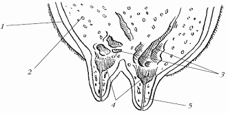 рогатого скота: 1 - ротовая полость; 2 - язык; 3 - подъязычные слюнные железы;