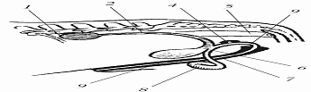 4 - подчелюстная слюнная железа; 5- мягкое нёбо; 6 - глотка; 7- гортань; 8 -