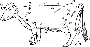 27 - венечная кость; 28 - копытцевая кость; 29 - крестцовая кость; 30 -