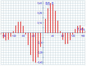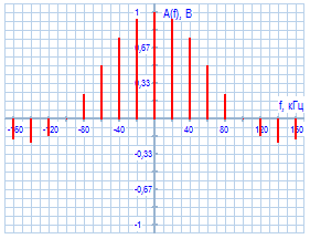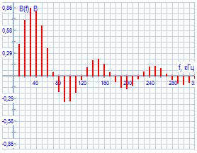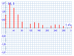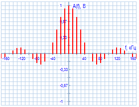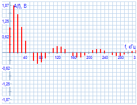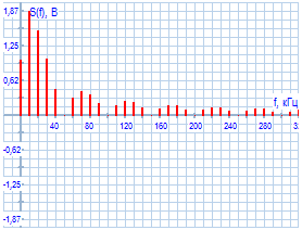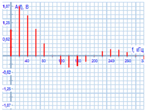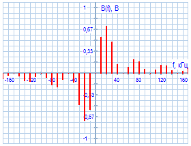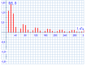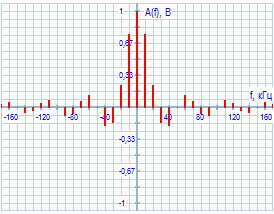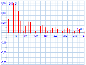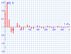 На графике появились составляющие в области f<0, т.к. в этом пункте мы рассчитывали в диапазоне (-f...f), в отличие от прошлого (0...f). Амплитуды полученных составляющих в два раза менье