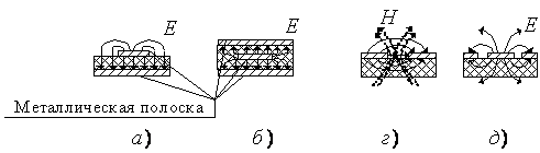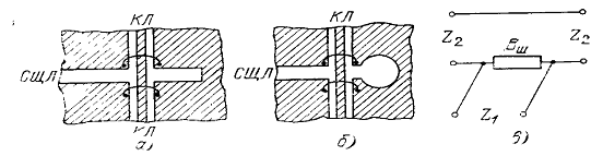 шлейфу(а),або кола вирізаного у шарі металу (б),еквівалентна схема(в)