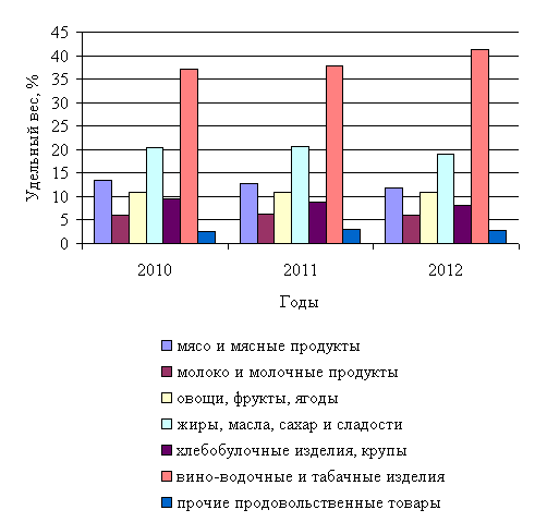 Товарооборот вино-водочных и табачных изделий за 2010 - 2012 гг увеличился на 2