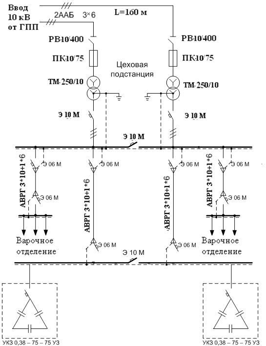 схема электроснабжения проектируемого цеха, были выбраны силовые кабеля,