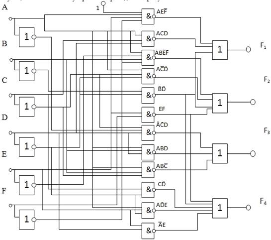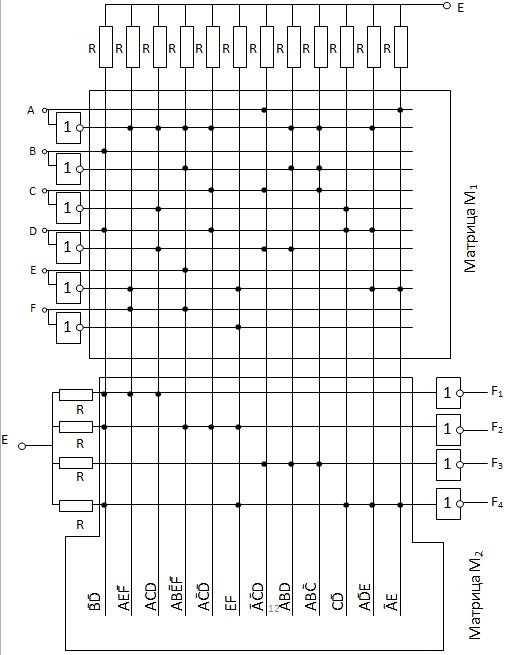 переменные А, В, С, D, E, F и их инверсии поступают в горизонтальные шины матрицы