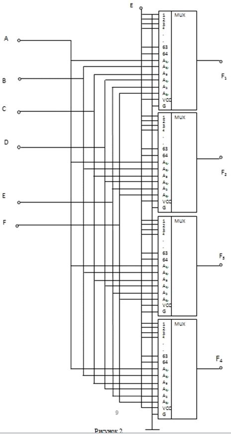 логические переменные A, B, C, D, E, F а на информационных входах 1-64 зафиксированы значения
