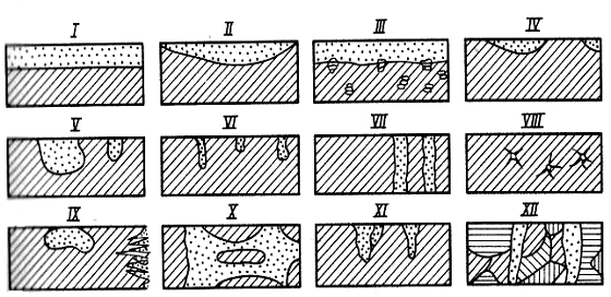 сквозное; VIII - нитевидное; IX - поверхностное; X - межкристаллитное; XI -