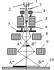 селекторная диафрагма, 8 - промежуточная линза, 9 - проекционная линза, 10 -
