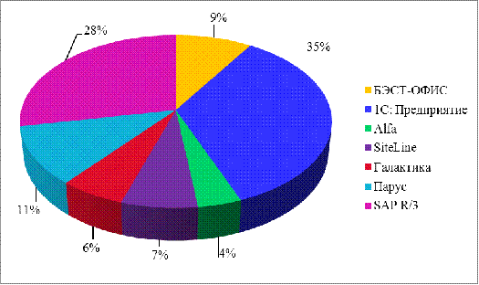 Предприятие (35 %), второе место занимает SAP R/3 28%), у остальных систем наименьший процент.