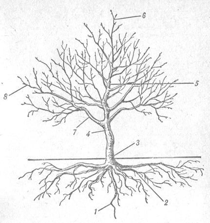 систему) и надземную (стебель), разделяющуюся на ствол, сучья, ветви и побеги.
