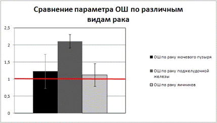 возникновения рака поджелудочной железы (ОШ - 2,11; ДИ - 1,91 - 2,31; χ² - 57,47).