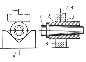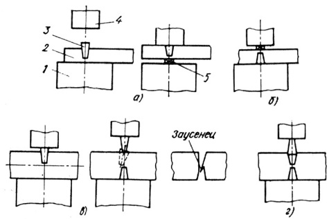 отрубки круглой заготовки с трех сторон: 1 − нижний вырезной боек; 2, 4 −