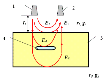 - излучающая антенна, 2 - приемная антенна, 3 - изделие, 4 -