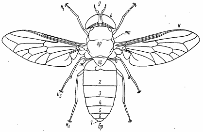 ж - жужжальце; н1, н2, н3 - передняя, средняя и задняя нога;