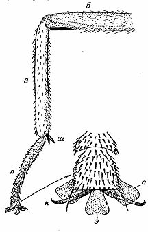 б - бедро; г - голень; л - лапка; к - коготок; п - пульвилла; э -