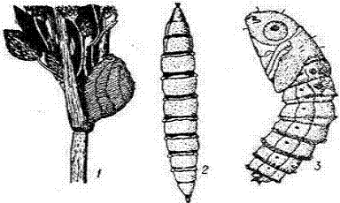 - кладка яиц на растении; 2 - личинка; 3 - куколка.