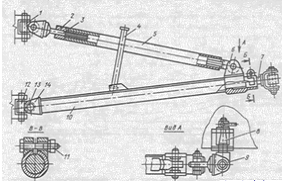 закреплен на неподвижном толкающем брусе 3, а верхний шарнир 14 упора 9 - на