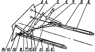 вертикальной плоскости с шарнирами 12 крепления отвала 2 к подвижным толкающим