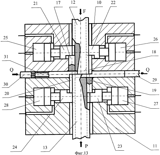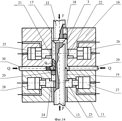 центральном отверстии разъемной матрицы с образованием каналов, пуансоны