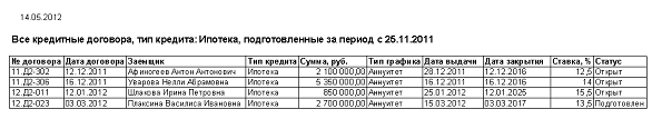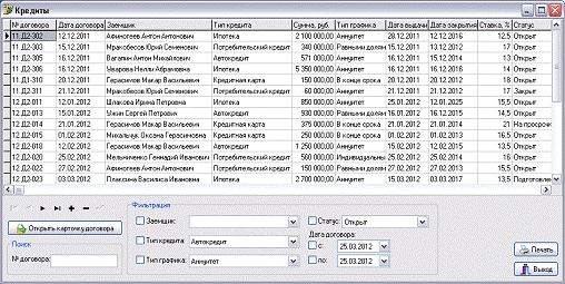 - выборка кредитных договоров по заданным критериям;