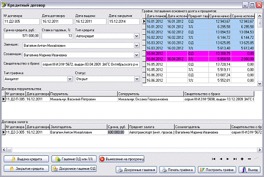 - учет поручителей и залогодателей по кредиту;