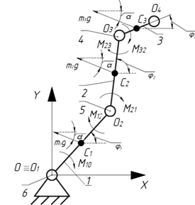 кут нахилу і-ї ланки до осі ОХі; хі, уі;- координати центрів мас і-ї ланки в