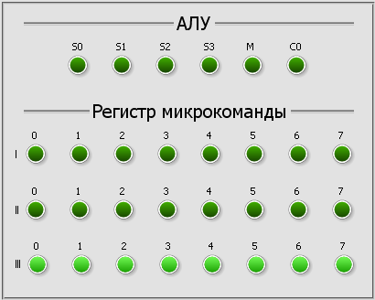 все 6 восьмиразрядных слов микропрограммы, а индикаторы регистра микрокоманды