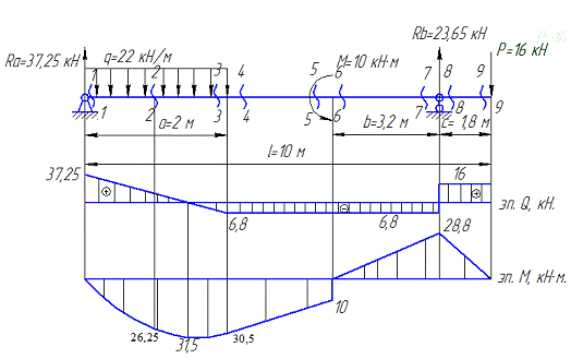 M4-4=RA2-q2·1=37,25·2-22·2·1=30,5 кН·м.-5=RA5-q2·4=37,25·5-22·2·4=10,25