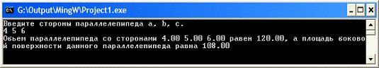 параллелепипеда равна %.2f\n"),a,b,c,v,s); // вывод результатов(); //