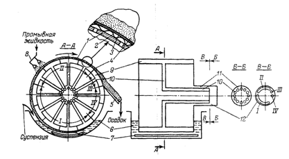 подвода промывной жидкости; 9 - ячейка барабана; 10 - трубы; 11, 12 -