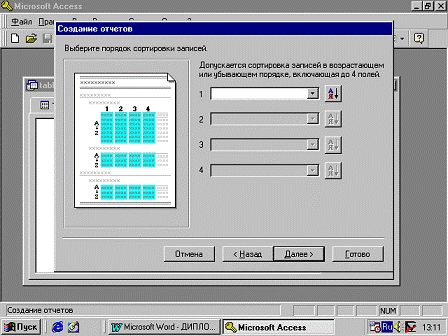 После чего Мастер отчетов предлагает ввести сортировку. Допускается