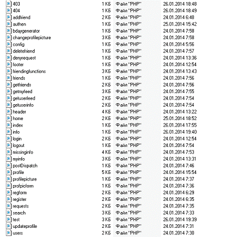 в которой располагаются файлы index.php, home.php, header.php, addfriend.php, missinginfo.php, profpicform.php и т.д. Файл index.php