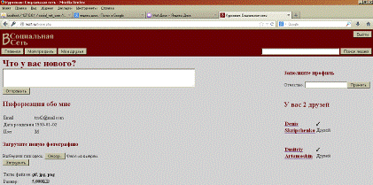 личных профилей, задавать и поддерживать списки друзей, загрузки фотографии