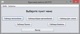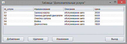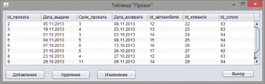 дата возврата, id_автомобиля, id_клиента, id_услуги. Возможно редактирование, добавление, удаление данных.