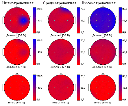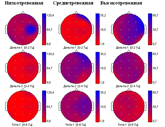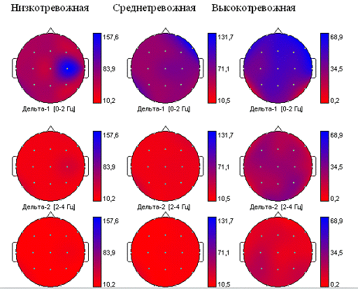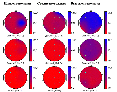 головного мозга у низко-, средне- и высоко- тревожных испытуемых.