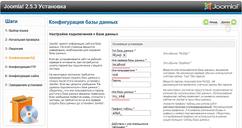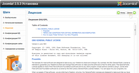 чтобы установить Joomla! Затем должна загрузиться страница с лицензией GNU/GPL,