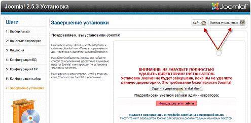 После завершения установки можно перейти в панель Администратора www.mysait.ru/administrator