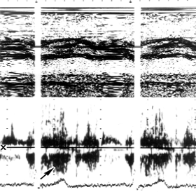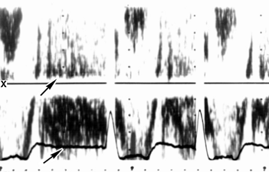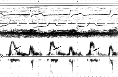 переднее движение в систолу (указано стрелкой) и снижение скорости